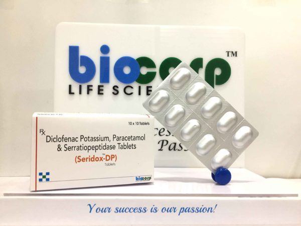 Available with the brand name SERIDOX-DP in the Indian Market, these tablets are manufactured and supplied by the Best Diclofenac Potassium, Paracetamol & Serratiopeptidase Tablet Manufacturer, Biocorp Life Sciences. Together, these medicines help the patient to get a relief from pain, inflammation, and fever.